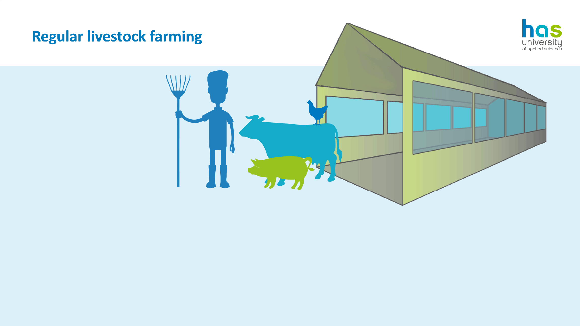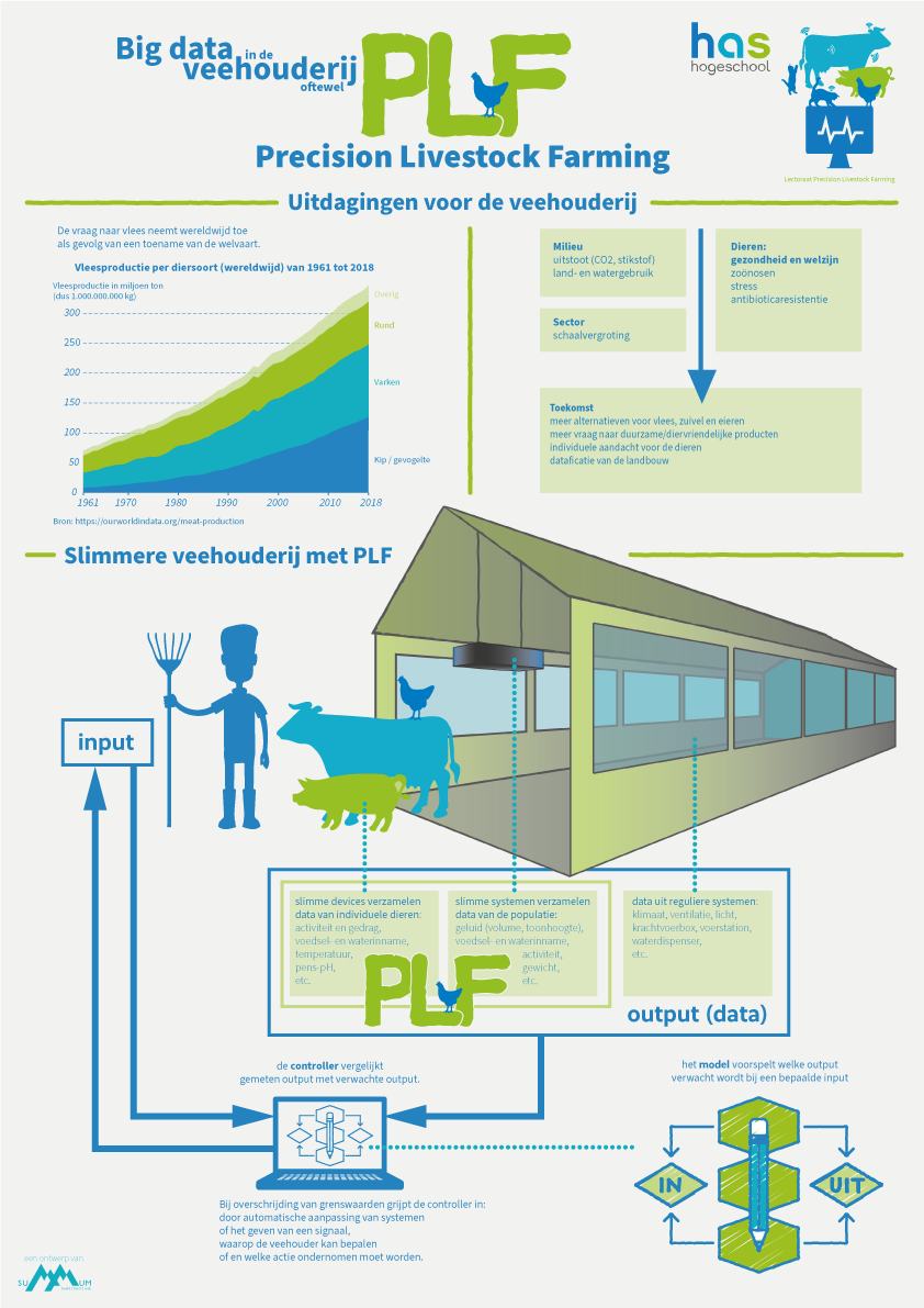 Voor het lectoraat Precision Livestock Farming (PLF) van de opleiding Dier- en Veehouderij van de HAS Hogeschool in Den Bosch maakte Summum een infographic over het waarom en wat van LPF. Hiervoor vertaalde (en verbeterde) ik een bestaand wetenschappelijk model naar een meer visuele en aantrekkelijker weergave. Het maken van de infographic was onderdeel van een opdracht voor mijn opleiding Grafische Vormgeving, maar de HAS vond mijn visualisatie zo helder, dat ze me vroegen deze om te zetten naar een PowerPointpresentatie om te gebruiken voor de colleges. Als basis voor de vormgeving gebruikte ik de dieren (koe, varken, kip) uit het logo van het lectoraat. Hoewel PowerPoint daar niet echt voor bedoeld is, werd het eerder een animatie dan een PowerPoint.